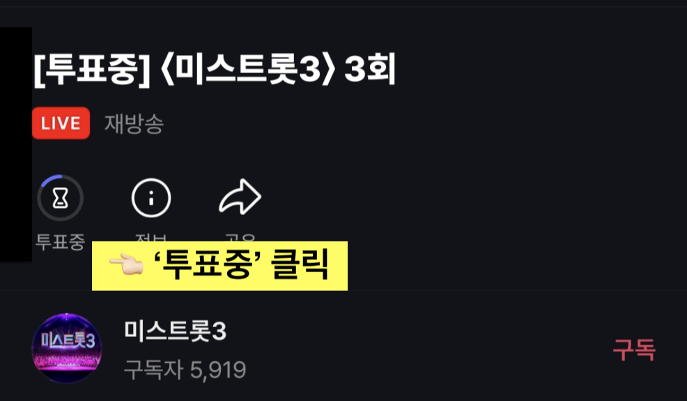 📌 혹시 "투표하기" 배너가 안 뜨는데요? 하시는 분은 그날은 아마 목요일일 가능성이 높습니다. 본방송 하는 날은 투표를 하지 않습니다. 본방송이 끝나면 다시 참가자가 바뀌기 때문에 투표화면이 바뀌기 때문입니다.