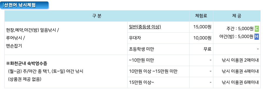 만약, 당일에 화천에서 숙박을 하신다면 영수증 보여주시면 밤낚시 이용권이 무료입니다.